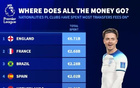 德转按会籍列英超引援花费榜:英格兰领跑,法国巴西分列二三